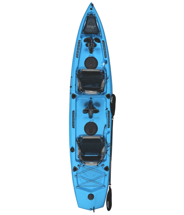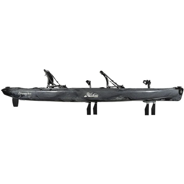 The Hobie Mirage Compass Duo 13’6 Tandem Sit On Top Pedal Drive Kayak is Hobie’s latest two-person sit on top. The Compass Duo takes the ultra popular Compass design and incorporates a second seat and drive for tandem pedal / paddling. The Compass Duo is a new budget-friendly tandem offering, making the performance of the Mirage Pedal Drive more available to the masses. The Compass is a blend of the popular Outback and Pro Angler models, in a slightly more stripped down version to keep the cost down. The Compass features one Mirage MD 180 and one Mirage GT Pedal Drive, upgraded anodized aluminum alloy frame seat offering incredible comfort, recessed spring-loaded rudder, simplified steering, generous cargo room, Lowrance Ready transducer mount, and the all new Hobie H-Track for easy accessory customization.